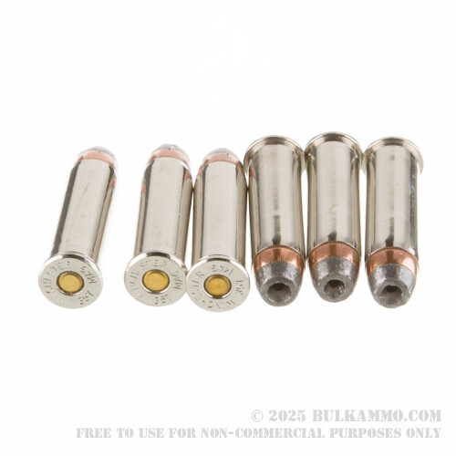 This cartridge features Winchester’s nickel plated brass casing. It is reloadable, sleek enough to slide in and out of a cylinder without coaxing, able to resist the kind of corrosion that a hunt in the wilderness could pose a threat of, and even easier to see in low light conditions. A non-corrosive primer and clean burning propellant make this round even better for your pistol!
